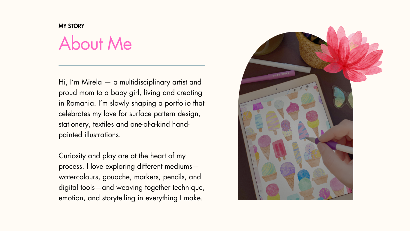 This moment of stillness led me back to creativity—something I had longed for without realising it. By chance, I discovered surface pattern design, a field completely new to me, yet it immediately felt like home. I dove in headfirst, eager to learn everything I could, experiment, and let my curiosity guide me.